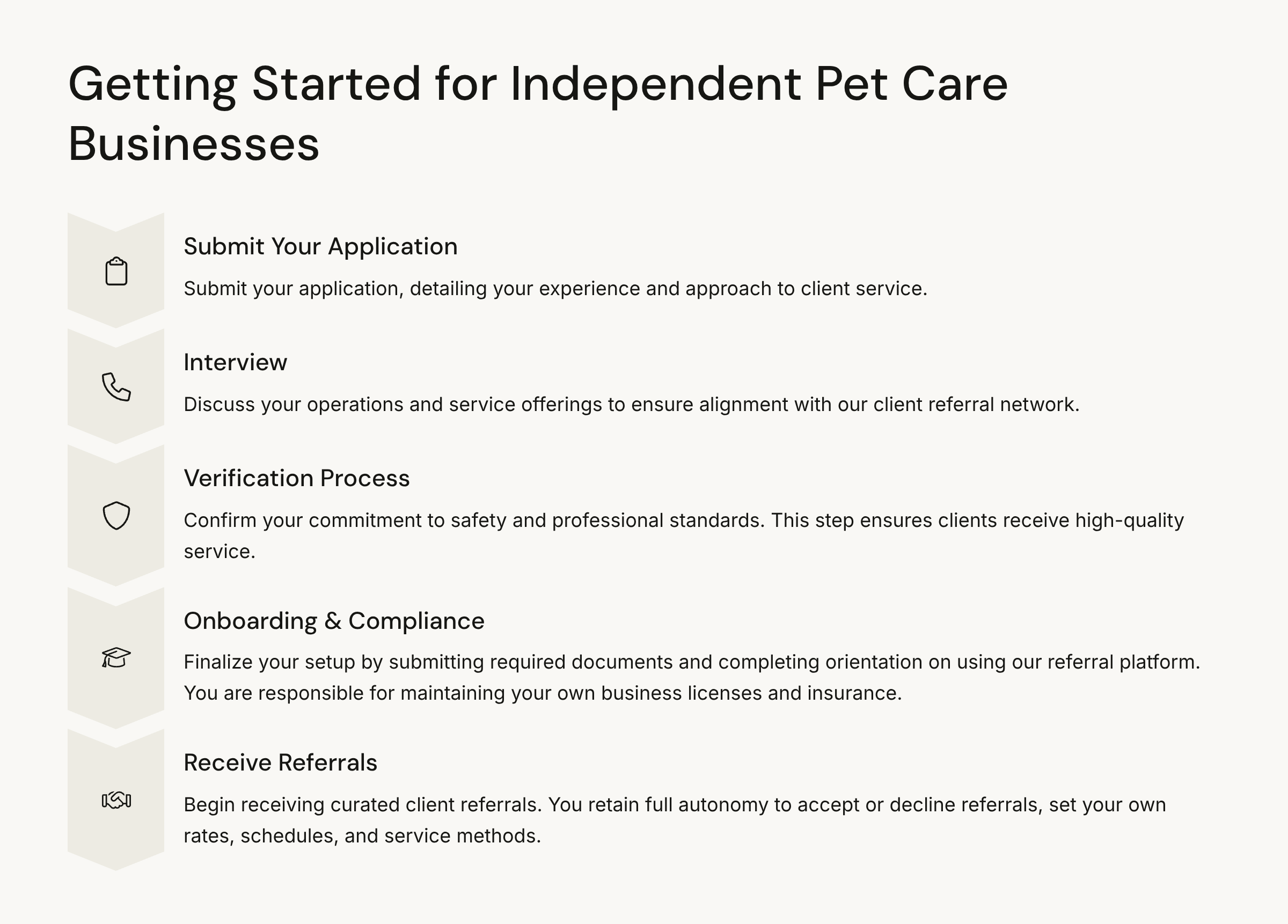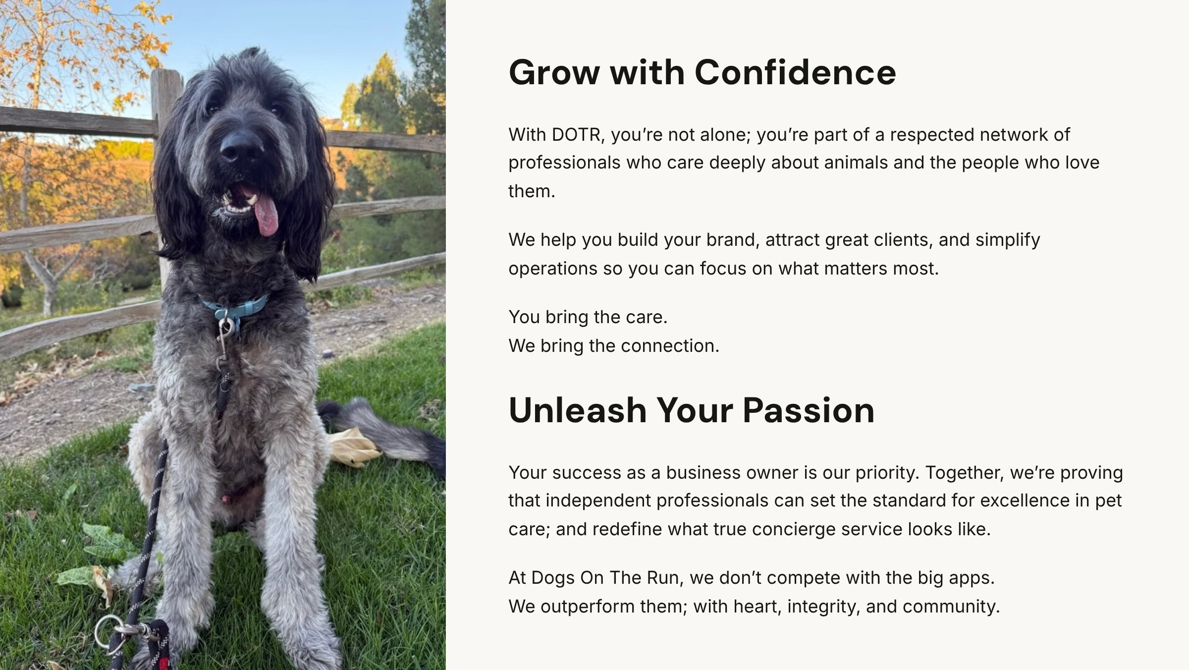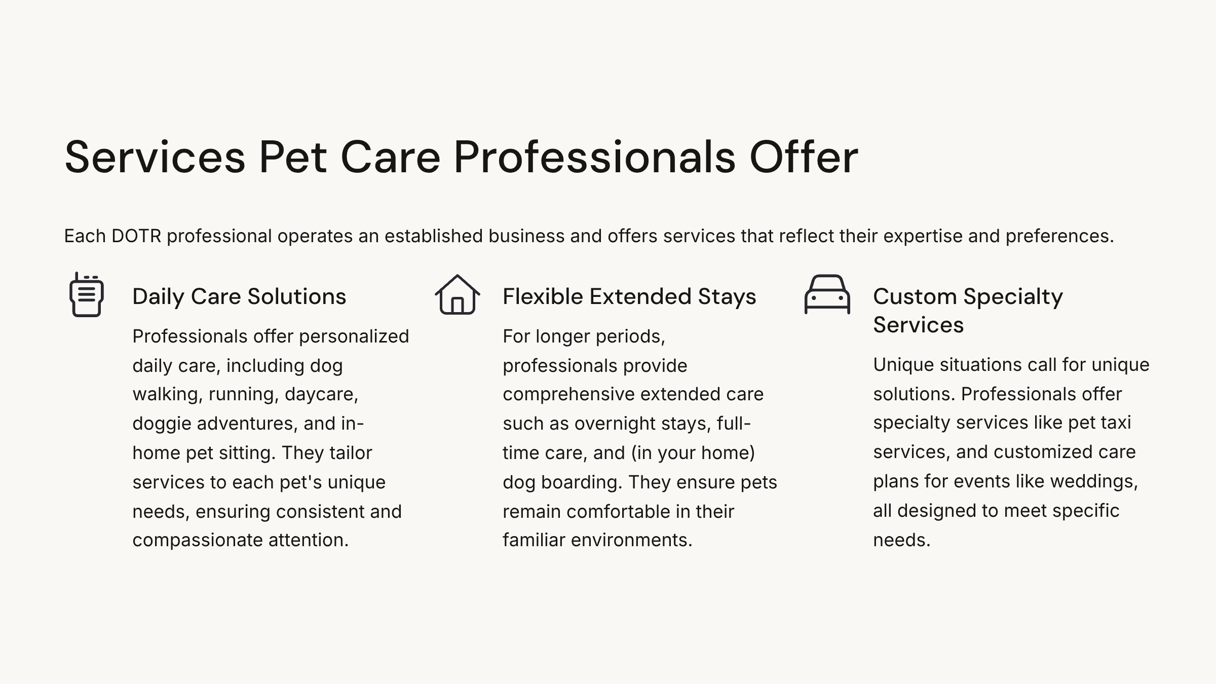 Apply to Join Our NetworkAre you interested in working with DOTR as an Accredited Pet Care Professional? Slide 1 Slide 1 (current slide) Slide 2 Slide 2 (current slide) Slide 3 Slide 3 (current slide) Slide 4 Slide 4 (current slide) Slide 5 Slide 5 (current slide) Slide 6 Slide 6 (current slide) Slide 7 Slide 7 (current slide) Slide 8 Slide 8 (current slide) Slide 9 Slide 9 (current slide) Get Started