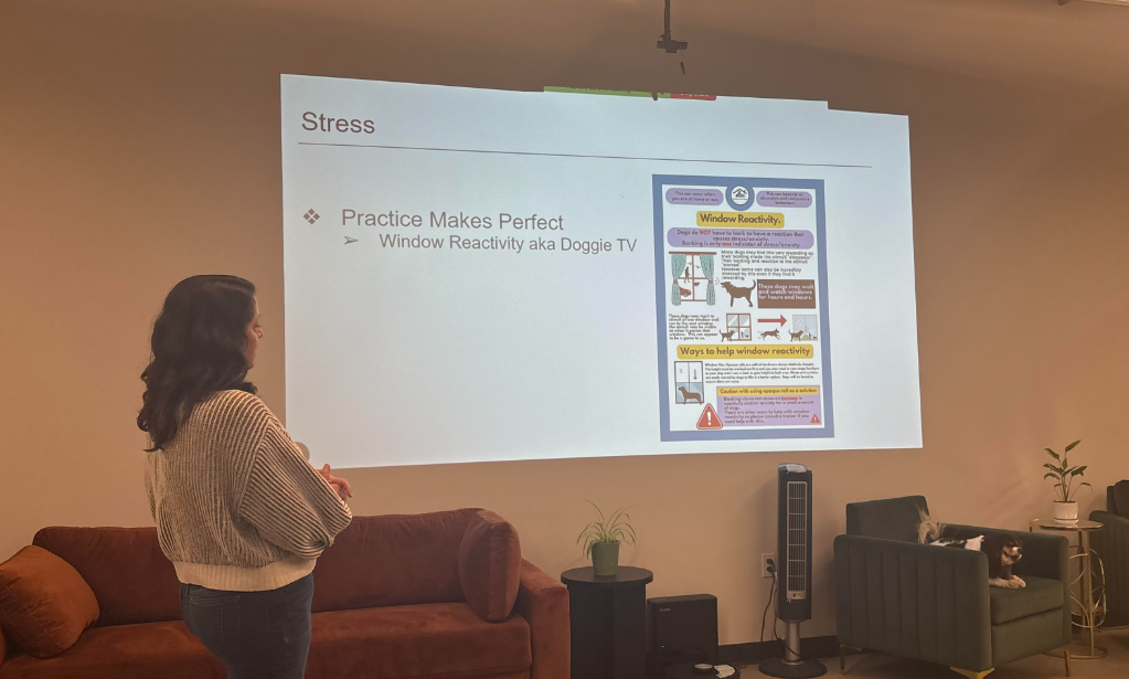 The workshop explored how stress accumulates through trigger stacking, flooding, overstimulation from neighborhood walks, and even “window reactivity” at home. When stress hormones like cortisol remain elevated, dogs are more likely to react quickly and intensely.