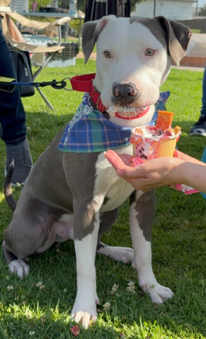 This pet-friendly event proved to be a huge success, drawing residents, animal lovers, and entrepreneurs from across San Diego. The park was bustling with activity as local businesses showcased their services, including dog groomers, doggy daycare providers, and even rescue organizations dedicated to finding forever homes for pets in need. As you can see below, Sherman, who is available for adoption via Passion for Pitties eating a “Pup Cup” from Rugers Rescue, a local San Diego Rescue. He loved this one of kind treat filled with whip cream and delicious fruit!